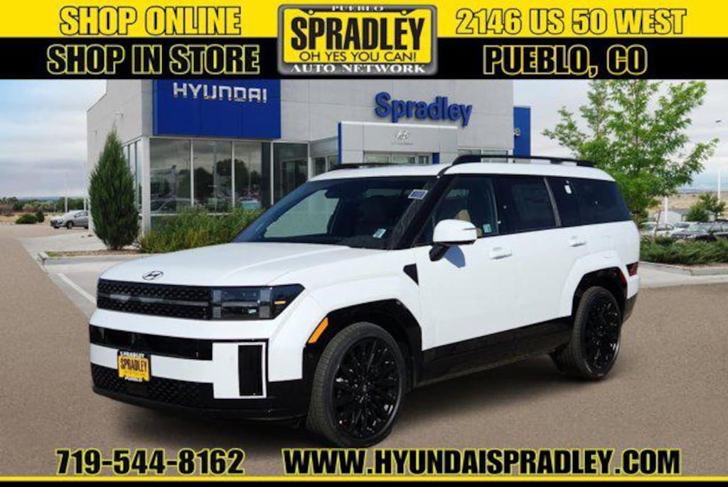 KBB Fair Market Range Low: $47,800 Serenity White 2026 Hyundai Santa Fe Calligraphy AWD 8-Speed Automatic with SHIFTRONIC 2.5L I4 AWD, Pecan Brown Leather.
